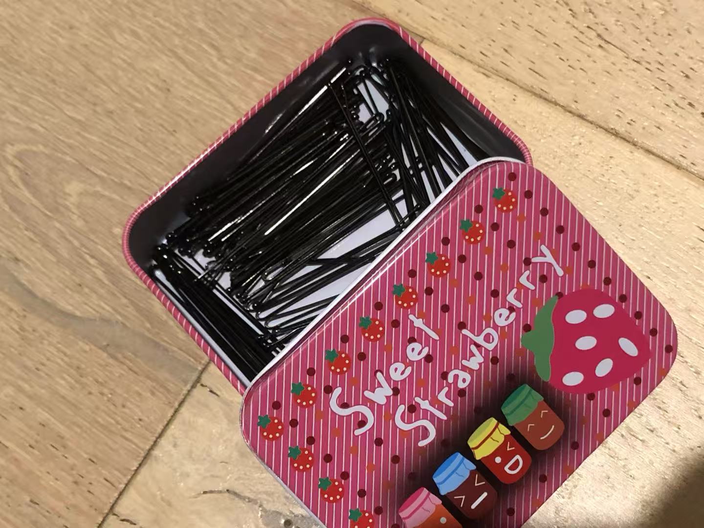 Black Hair Straighteners (20 pieces)Packaging: Tin box with a cute strawberry patternColor: Classic blackMaterial: Metal with eco-friendly coating
