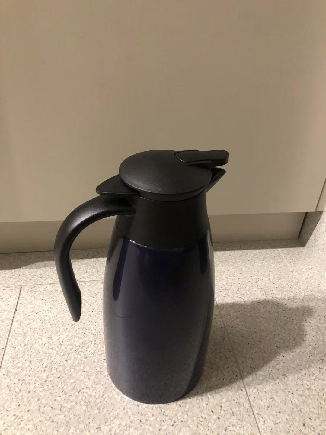 Color: Dark blue body with black lid and handleMaterial:High-strength plastic bodyPossibly stainless steel linerCapacity: 2LInsulation: Keeps water warm for extended periods, perfect for drinking, brewing tea, or mixing milkHandle: Ergonomic handle for a comfortable grip